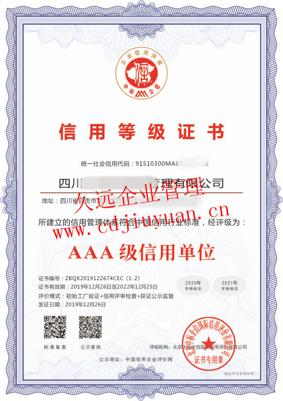 AAA級(jí)企業(yè)信用等級(jí)證書